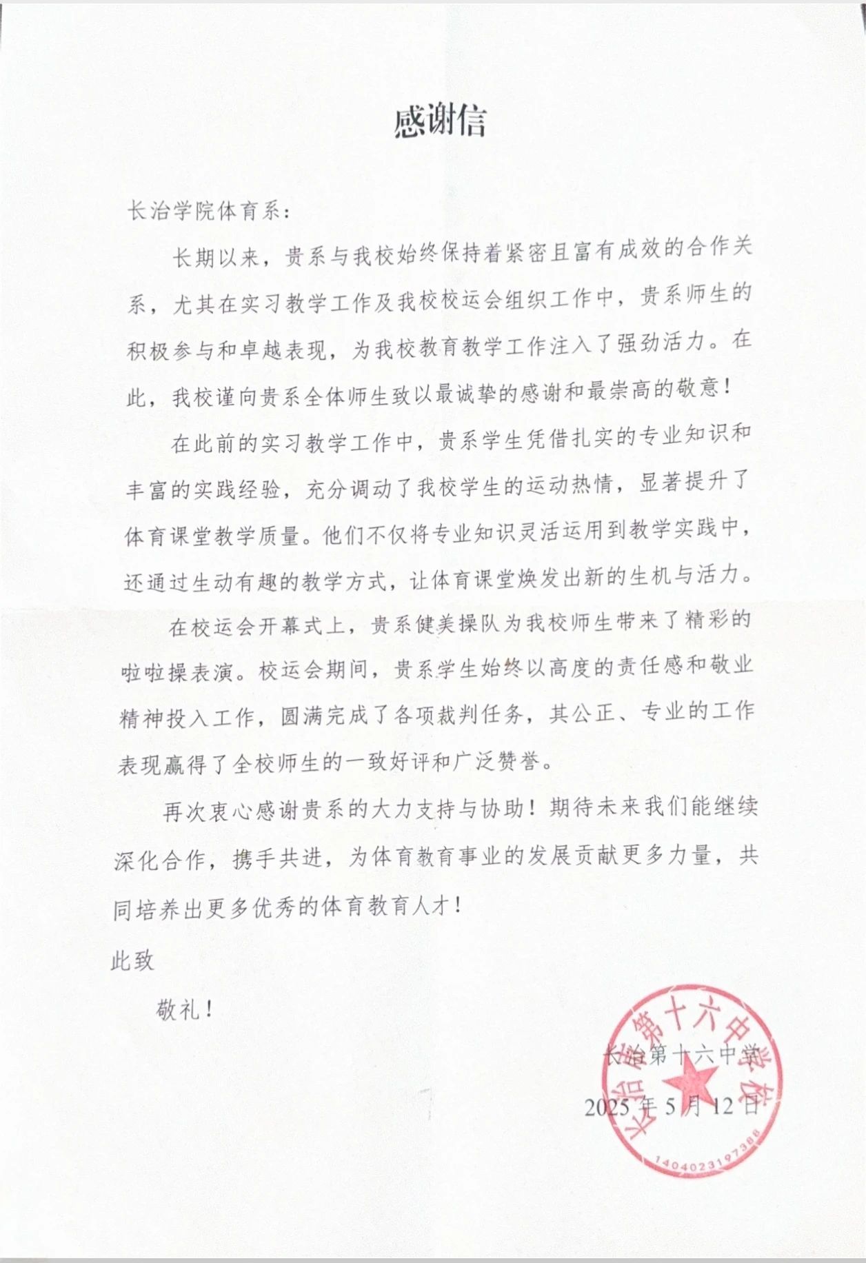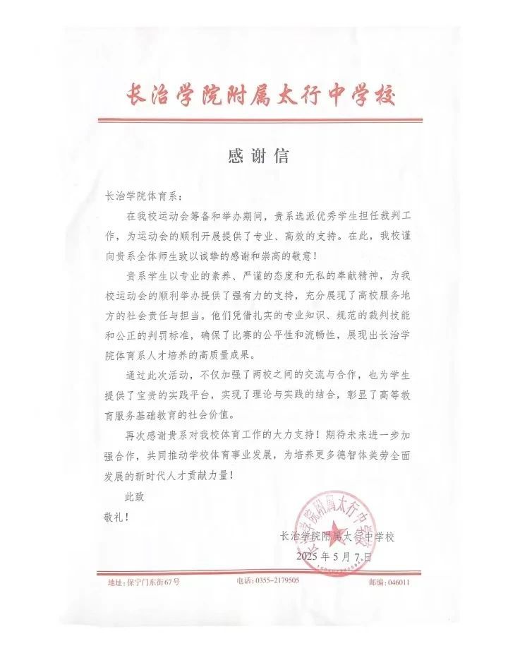 受太行中学和长治市第十六中学邀请,必威西汉姆联选派优秀学生前往两校运动会承担裁判工作和开幕式啦啦操表演任务。学生们凭借扎实的专业素养、严谨的工作态度和出色的组织能力,圆满完成了各项裁判和表演任务,赢得了两校师生的一致认可和高度赞扬。