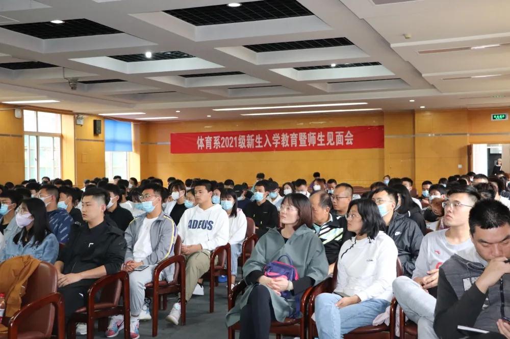 系主任李明老师为新生致辞,李明老师希望同学们能够尽快完成从高中到大学的转变,努力学习,追求自己的奋斗目标,在将来为祖国作出自己的贡献。同时他提出两点要求:第一,做一个有理想、有责任、有担当、敢担当的体育人;第二,做一个勤于思考、努力学习的体育人。