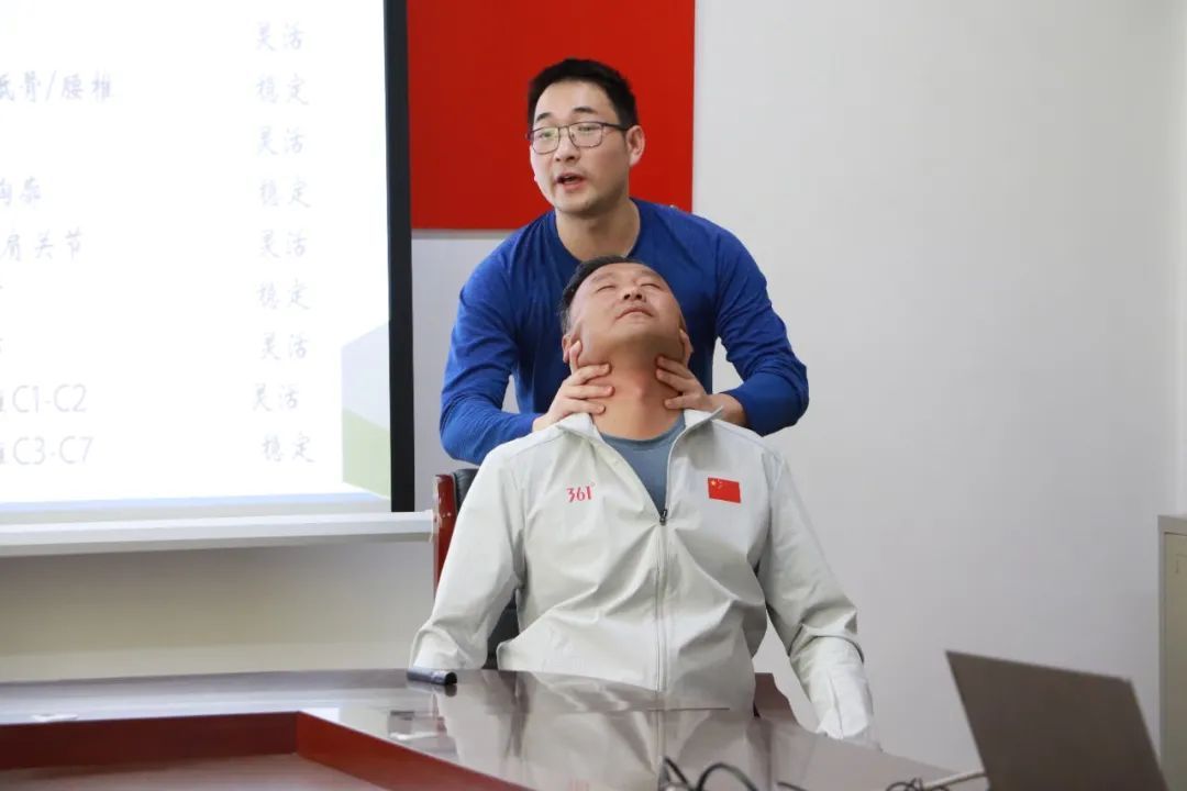 最后,陶雅浩进行现场实践指导,针对存在颈、腰椎疼痛的教师们示范了一系列简单易行且科学有效的康复训练动作。