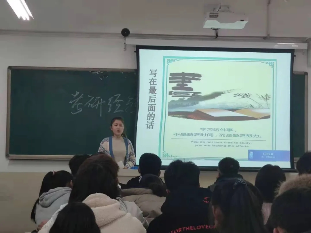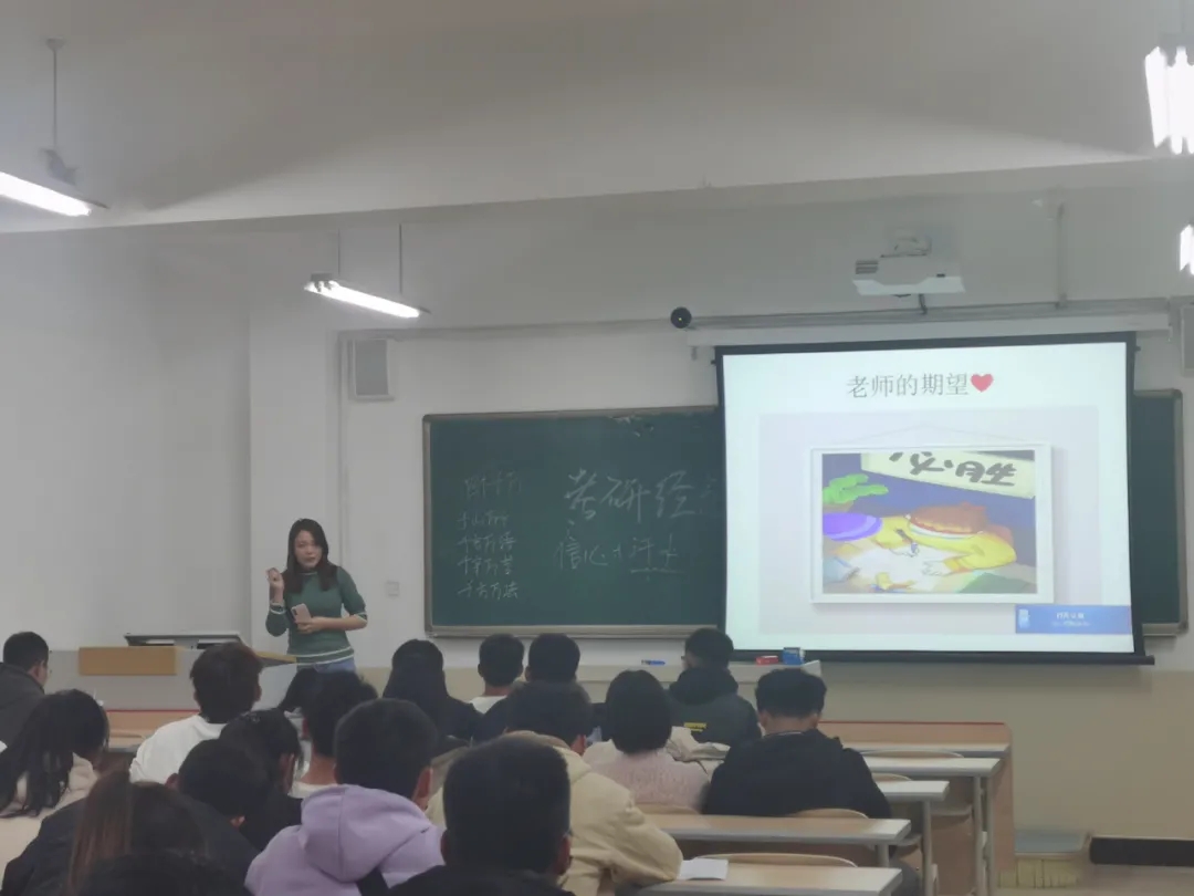 交流会第一个进行分享的是高晶晶老师。高晶晶老师对即将考研或有意愿考研的同学们需要查询的一些考研必要信息做了整理,以PPT形式展现出来,并建议学生最好提早确定考研院校或专业目标,然后多下苦功夫,多下真功夫,脚踏实地的走下去;其次借鉴好考研成功学生的一些好的经验,同时找到适合自己的学习方法,并推荐了一些有关于背英语单词好方法,并嘱咐大家要随时按自己的学习状态调整学习方法。随后,她对有意向考研的学生做了信心方面的鼓励,对他们考研成功作出了希望。